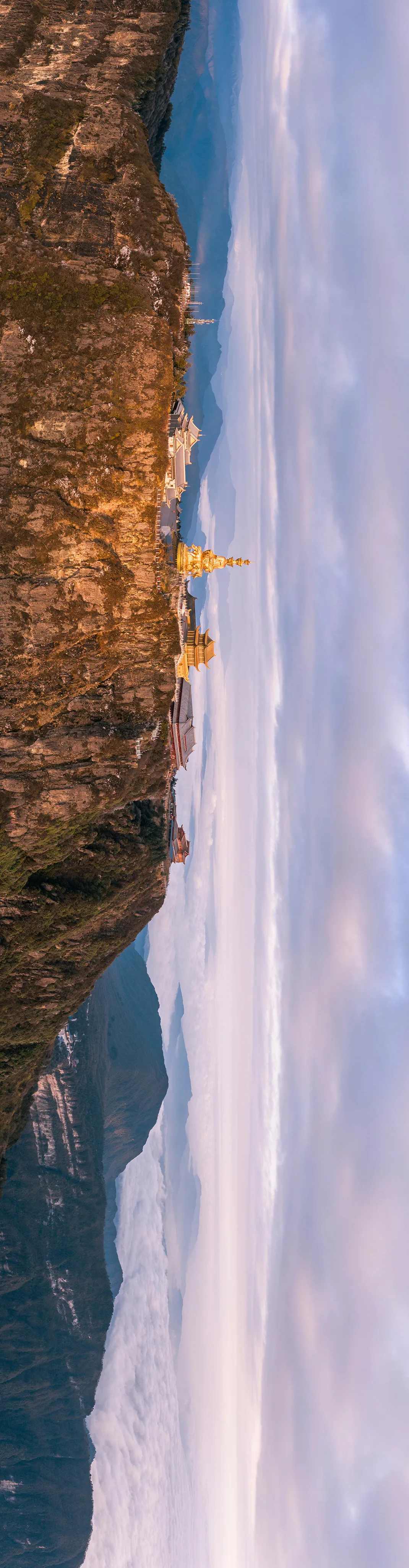 伴随着旭日东升,朝霞满天,万道金光射向大地,峨眉山宛似从头至脚逐渐披上金色的大氅,呈现出它全部的秀美身姿。此时此刻,天上地下变成金色的世界,象征着“早晨是黄金”之意,不陟高寒处,安知天地宽。