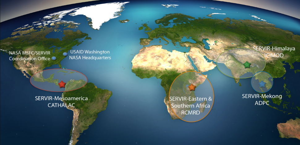 SERVIR是美国航天局与美国国际开发署合作建立的一个联合机构,同时也是一个由区域合作伙伴组成的全球合作计划,致力于通过整合地球观测和地理空间技术,服务全球环境管理。自2004年建立以来,SERVIR基于最先进的星载数据、监测信息、地理空间信息和预测模型及科学应用来提供重要信息和服务,已服务超过50个国家,开发70多种定制工具,与250多家机构合作,培训了约3000名区域支持人员,以帮助评估生态威胁,迅速响应自然灾害,改善区域环境决策。