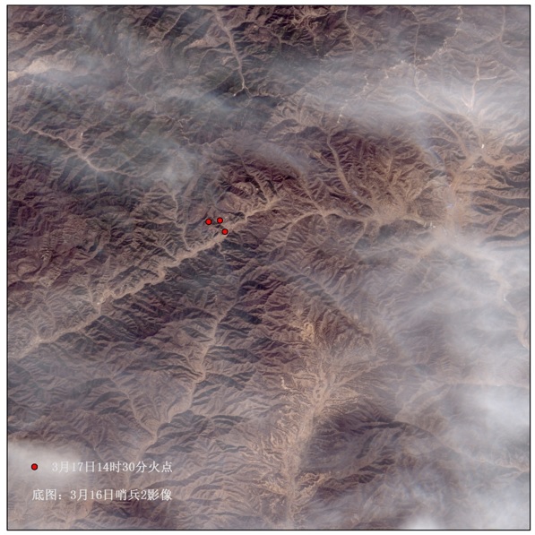 利用火点数据,结合高分系列卫星数据,对山西省榆社县及周边区域进行了持续监测。图1是3月17日下午14时左右的火点分布情况,底图是拍摄于灾前3月16日的哨兵2光学影像。