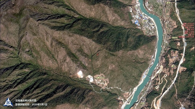 3月29日16时50分,云南省香格里拉市松园上村发生森林火灾,3月30日16时40分及18时许,宾川县乌拉乡及禄劝县翠华镇先后发生森林火灾。中心于3月31日启动应急响应,利用3月31日14时56分获取的高分四号中红外数据及当日14时18分获取的美国极轨环境卫星系统预备计划(National Polar-orbiting Partnership,NPP)卫星VIIRS火点数据对火场进行了监测,第一时间生产了香格里拉市松园上村及禄劝县翠华镇灾前影像图,获取了2020年3月31日宾川县乌拉乡灾后2米/8米光学卫星星座数据,并同步制作了三处火场的三维立体场景,经快速处理及初步解译,宾川县乌拉乡火场影像可见过火面积约为220公顷。