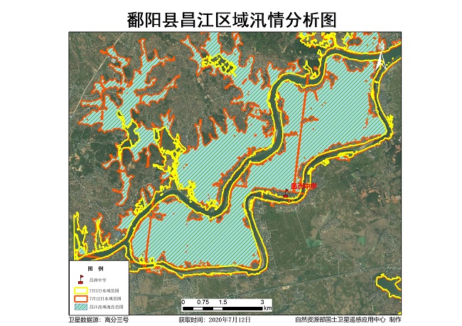 2020年7月9日,江西省上饶市鄱阳县发生决口漫堤。7月10日上午,应自然资源江西省卫星应用技术中心请求,自然资源部国土卫星遥感应用中心启动了江西省鄱阳县决堤漫堤应急监测,第一时间整理了灾前数据6景,包括6月12日高分一号2景、6月17日资源三号1景对、6月17日北京二号3景;协调获取了7月1日1景、3日2景、8日2景、12日2景高分三号雷达数据,对灾后高分三号雷达数据进行了快速处理,并开展了灾后水体范围提取工作,形成了灾区区位图、地势图、水体范围提取图及汛情分析图,具体监测成果如下: